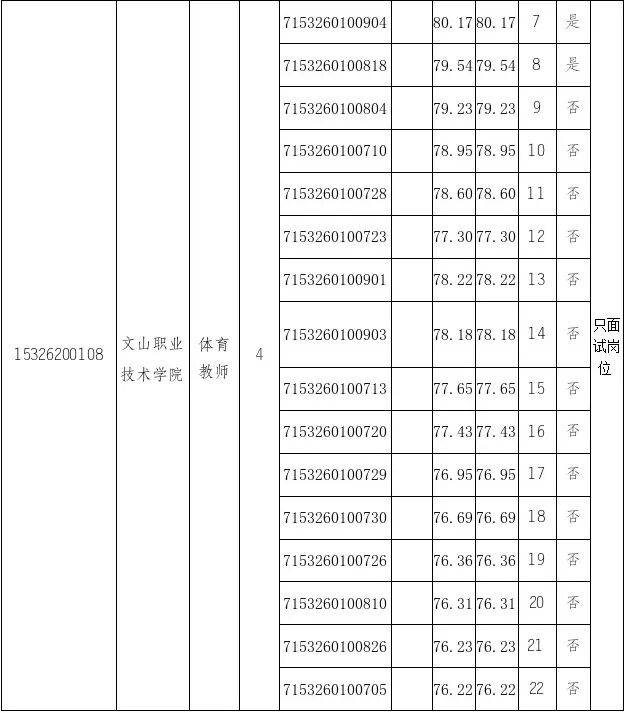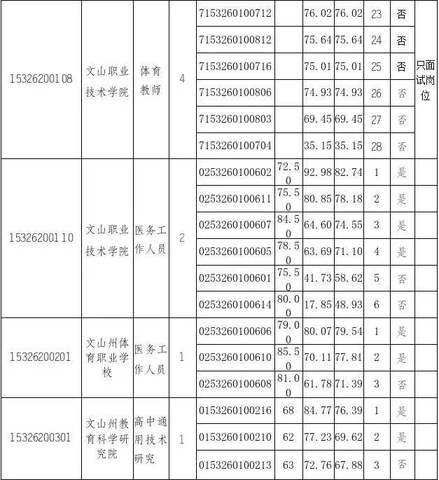 根据《2026年文山州教育体育局所属事业单位公开选调工作人员通告》《2026年文山州教育体育局所属事业单位公开选调工作人员笔试成绩及后续有关事项通告》规定的程序和要求,文山州教育体育局于2026年2月9日对文山职业技术学院数学、英语、思想政治、生物、信息技术、体育教师及医务工作人员,文山州体育职业学校医务工作人员,文山州教育科学研究院高中通用技术、高中思想政治教学、中学美术、中学音乐、初中劳技、小学科学、小学道德与法治研究,文山州教育信息化与装备中心文秘级教育信息宣传岗位通过资格复审进入面试环节的人员开展面试,现将面试成绩和综合成绩结果公示如下。