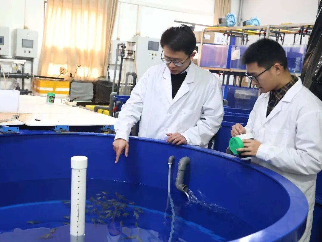 浙江海洋大学水产学院研究生王玉成(右)与导师郭浩宇观测实验鱼苗的状况。中国教育报记者 李柯 摄