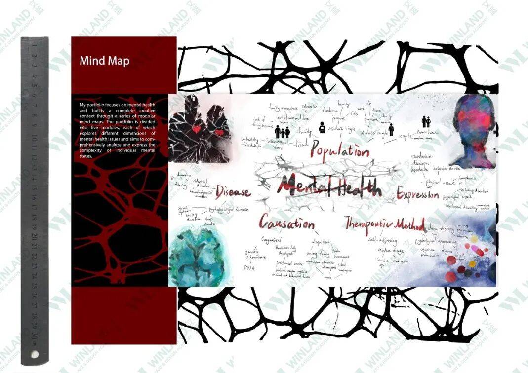 学生通过c1的作品集主题是关注心理健康,通过一系列模块化思维导图构建一个完整的创作背景。作品集分为五个模块,每个模块探索心理健康问题的不同维度,并旨在全面分析和表达个体心理状态的复杂性。