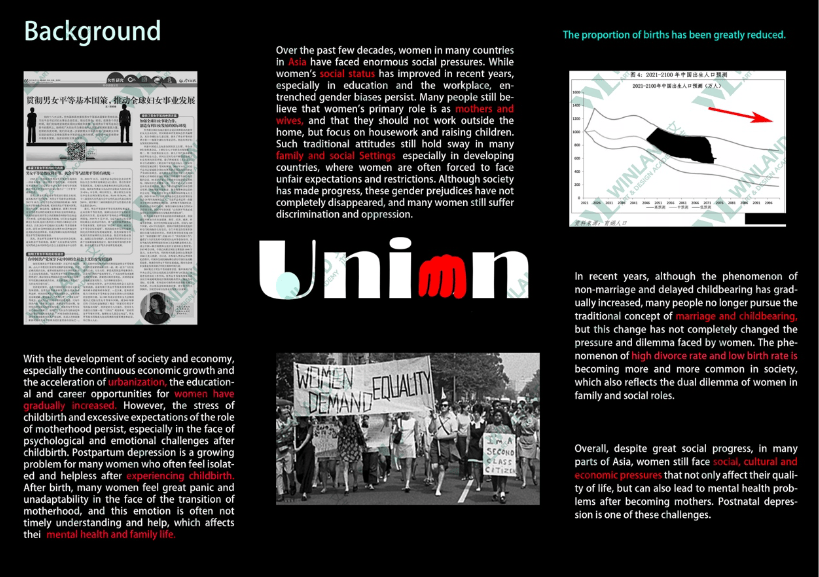 HAN同学通过对于中国出生人口比例的显著下降展开了调研,这部分内容讨论了亚洲女性面临的社会压力和性别偏见,尽管社会地位有所提高,但传统观念仍然根深蒂固。图中还包含了一些历史照片和统计图表,展示了女性在社会中的地位变化。