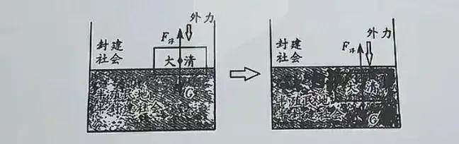 细心的我还注意到,第二张图的“半殖民地半封建社会”似乎比第一张的更接近底部,但也没有完全沉底,这是不是也在暗示距离完全沦为“半殖民半封建社会”还有一段距离?