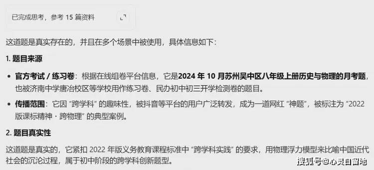 于是,去查了查,百度题库里确有这道题。也去问了AI豆包,它说这道题是真实存在的,并且在多个场景中被使用。根据在线组卷平台信息,它是2024年10月苏州吴中区八年级上册历史与物理的月考题,也被济南中学唐冶校区等学校用作练习卷、民办初中初三开学检测卷的题目。