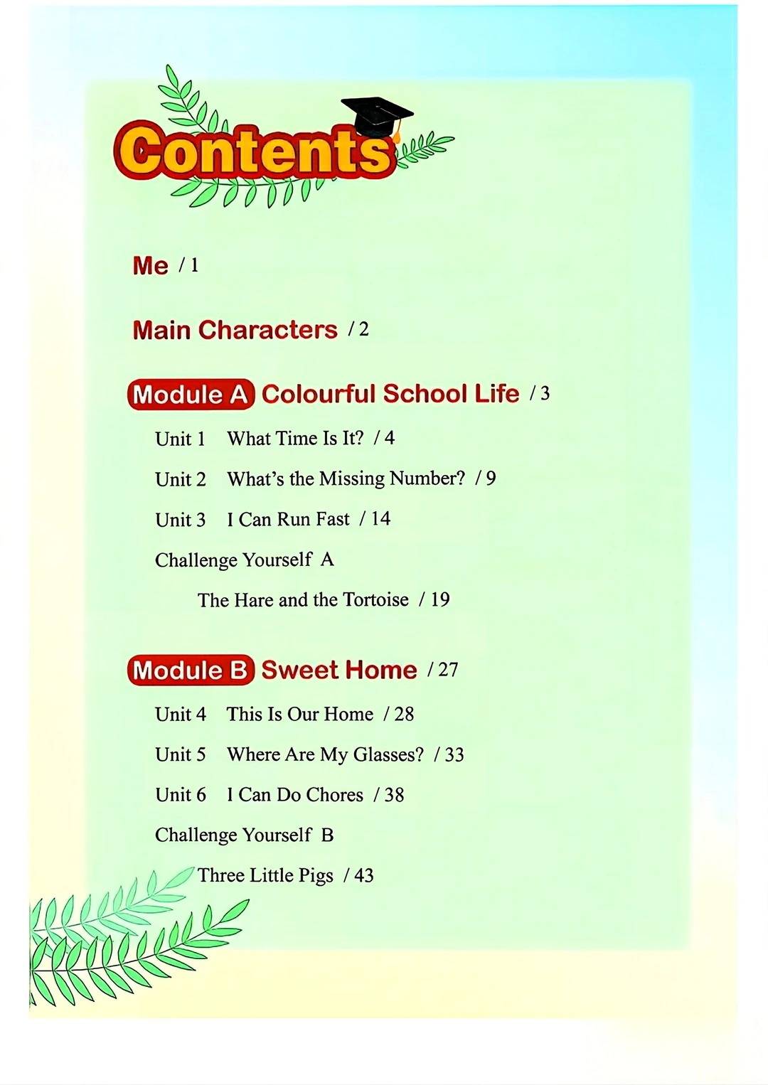 Module A “Colourful School Life” 以校园为舞台,让孩子们在熟悉的环境中学习英语。从询问时间 “What Time Is It?” 到寻找数字规律 “What’s the Missing Number?”,再到展示运动能力 “I Can Run Fast”,每一个单元都围绕校园生活展开。孩子们不仅能学到时间表达、数字词汇和运动短语,更能在角色扮演和对话练习中,自然地运用英语交流,感受英语作为沟通工具的实用性。《The Hare and the Tortoise》的故事则巧妙地融入了坚持的道理,让学习更有深度。