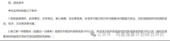在报考具体条件上的表现一是高考成绩的要求,大多高校要求成绩达到特殊控制线;另一方面就是重点高校对考生平时成绩的要求,如:北京外国语大学2025年一带一路外语专业综合评价招生简章中要求:高三第一学期期末(或最近一次模考)成绩在年级同科类排名前10%以内,并且语文和外语成绩均在同科类排名的前10%以内(我校生源基地校和省级示范校可适当放宽排名限制)。