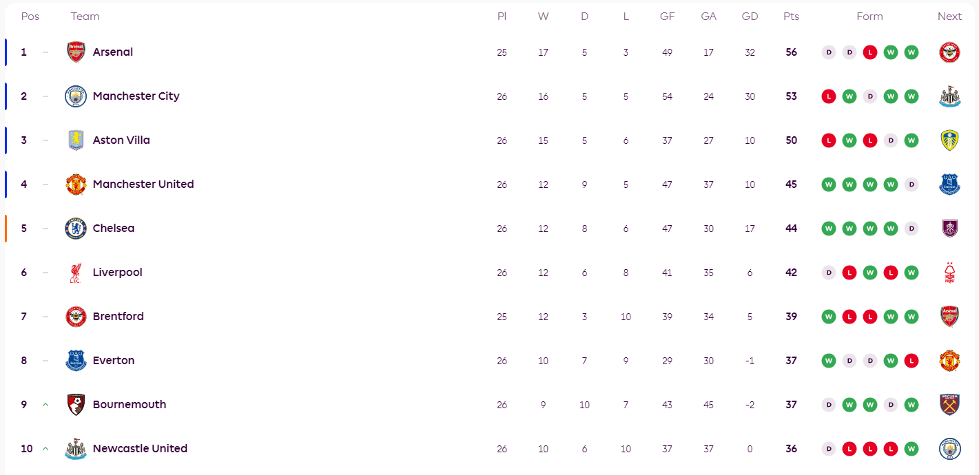 北京时间2月12日,英超第26轮战罢多场,仅剩领头羊阿森纳客战布伦特福德一役,积分榜情况如下: