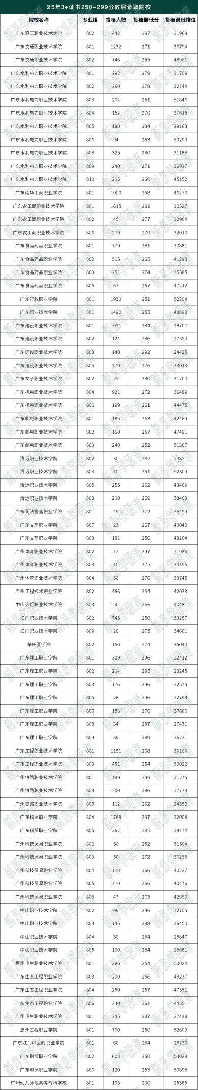 250-299分分数段涉及34所公办院校的81个专业组,广东轻工职业技术大学、广州铁路职业技术学院等院校的多个专业组投档最低分集中在270-299分之间。