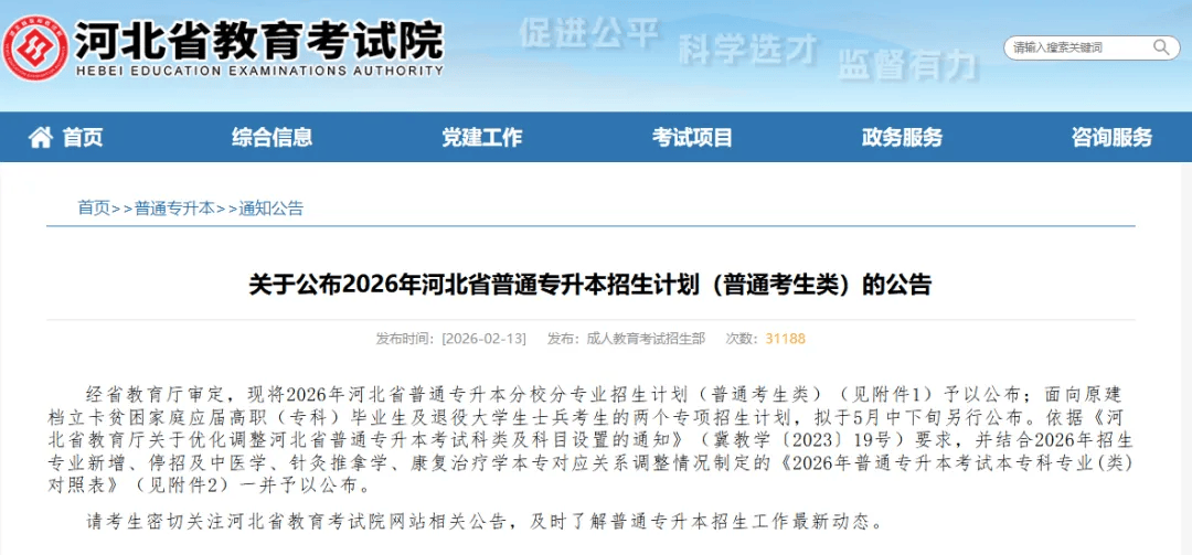 河北省教育考试院最新发布关于公布2026年河北省普通专升本招生计划(普通考生类)的公告↓↓↓