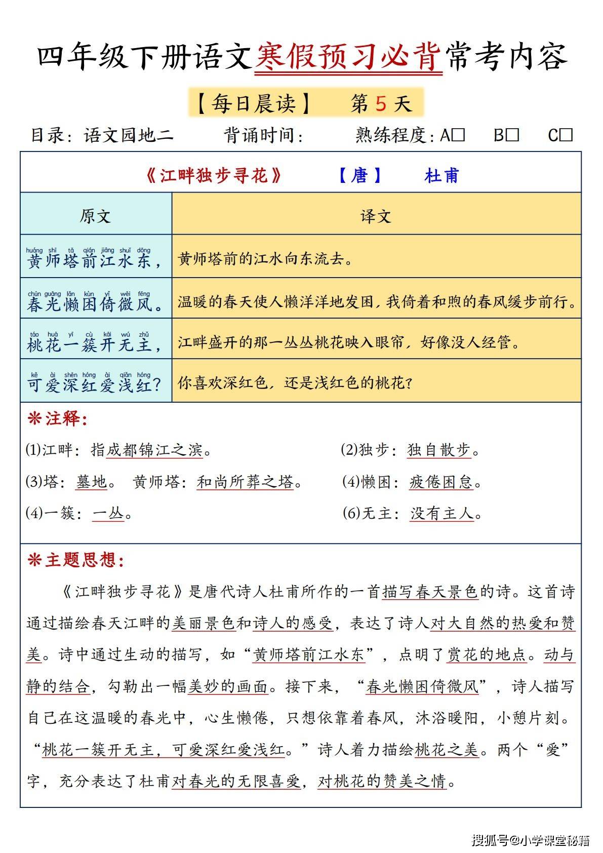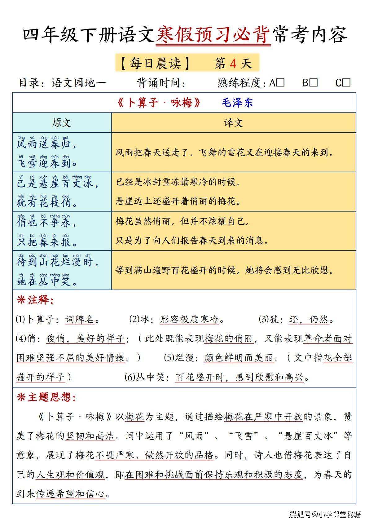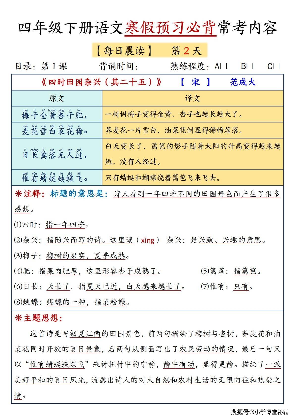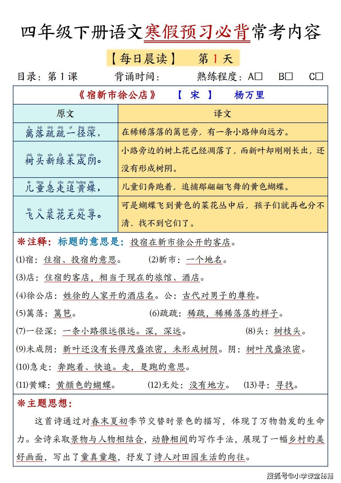 今天为大家分享:四年级下册语文寒假预习必背常考内容,以每日晨读的形式,围绕第 1 课和语文园地的古诗词展开,包含《宿新市徐公店》《四时田园杂兴(其二十五)》《清平乐・村居》《卜算子・咏梅》《江畔独步寻花》五篇作品,为学生提供了系统的预习和背诵素材。