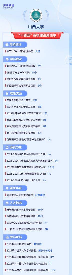 山西大学是中国办学历史最悠久的高等学府之一,作为老牌重点大学,山西大学一步一个脚印,实现了从地方高校到高等教育“国家队”的历史性跨越,哲学、物理学两个学科入选“双一流”建设学科。“十四五”期间,学校获得多项奖项荣誉,荣获1项国家自然科学奖二等奖、1项国家科技进步奖二等奖,1项国家级教学成果奖二等奖,1项首届“国家卓越工程师”奖……2025年11月,张靖教授当选中国科学院院士,实现了学校本土培养院士的新突破,也标志着学校“十四五”人才队伍建设补齐了最关键的一块拼图。