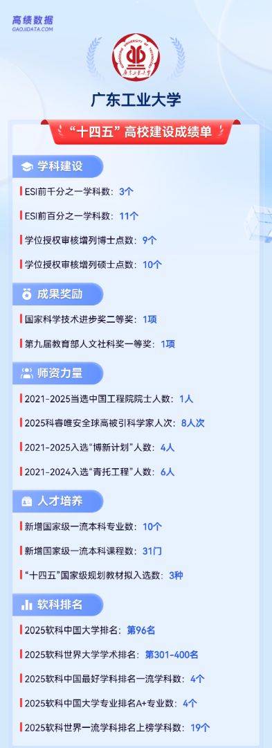 广东工业大学在2024软科中国大学排名中位列全国第100名,首次进入Top100;在2025软科中国大学排名中位列全国第96名,排名再次刷新!“十四五”期间,荣获1项国家科技进步奖二等奖,是学校建设高水平创新型大学道路上的标志性成果;荣获第九届教育部人文社科奖一等奖,是学校人文社科成果在获奖层次上的重大突破;2025年11月,广东工业大学陈新教授当选中国工程院院士,成为学校自主培养的首位院士,实现人才队伍建设新突破。
