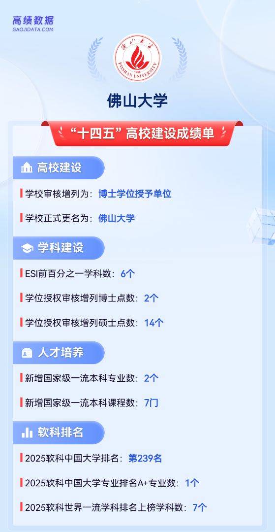 佛山大学则以火箭般的速度,2024一年内实现“更名大学”和“博士学位授权点”的两次关键性升级!2025年,学校新增为教育部推免资格高校,实现又一次跃升。佛山大学持续加强学科建设,6个学科跻身ESI前1%学科,“十四五”期间获批2个博士点和14个硕士点。学校向着建设服务地方特色鲜明的高水平应用研究型大学目标加速迈进!