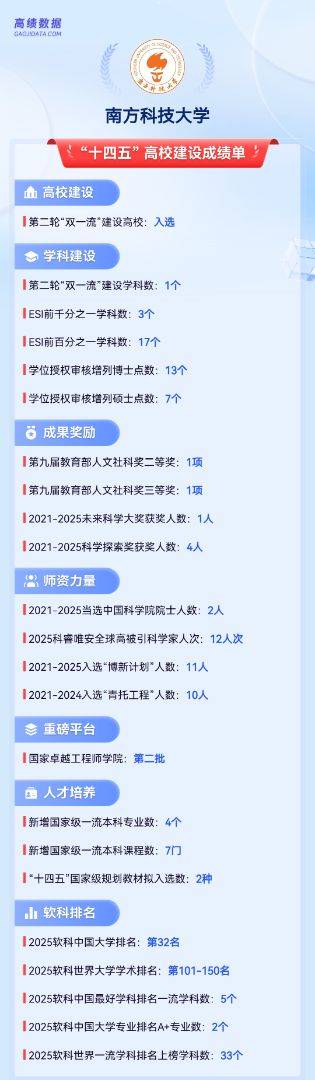 南方科技大学作为“10后”新型研究型大学,是“第四代大学”代表性高校。“十四五”期间,学科建设实现多项突破。3个学科成功新晋ESI全球前1‰,前1%学科数量达到17个,新增13个博士点、7个硕士点。此外,学校获批国家卓越工程师学院,两位教师当选中国科学院院士,全球高被引科学家达到12人次,在2025软科中国大学排名中位列全国第32名,发展速度惊人!