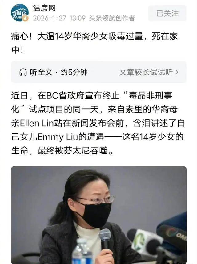 这句话,是一位叫Ellen Lin的华裔母亲说的。说这话的时候,她10岁就带到加拿大“见世面”的女儿,已经在床上死了快一年。死于芬太尼过量。