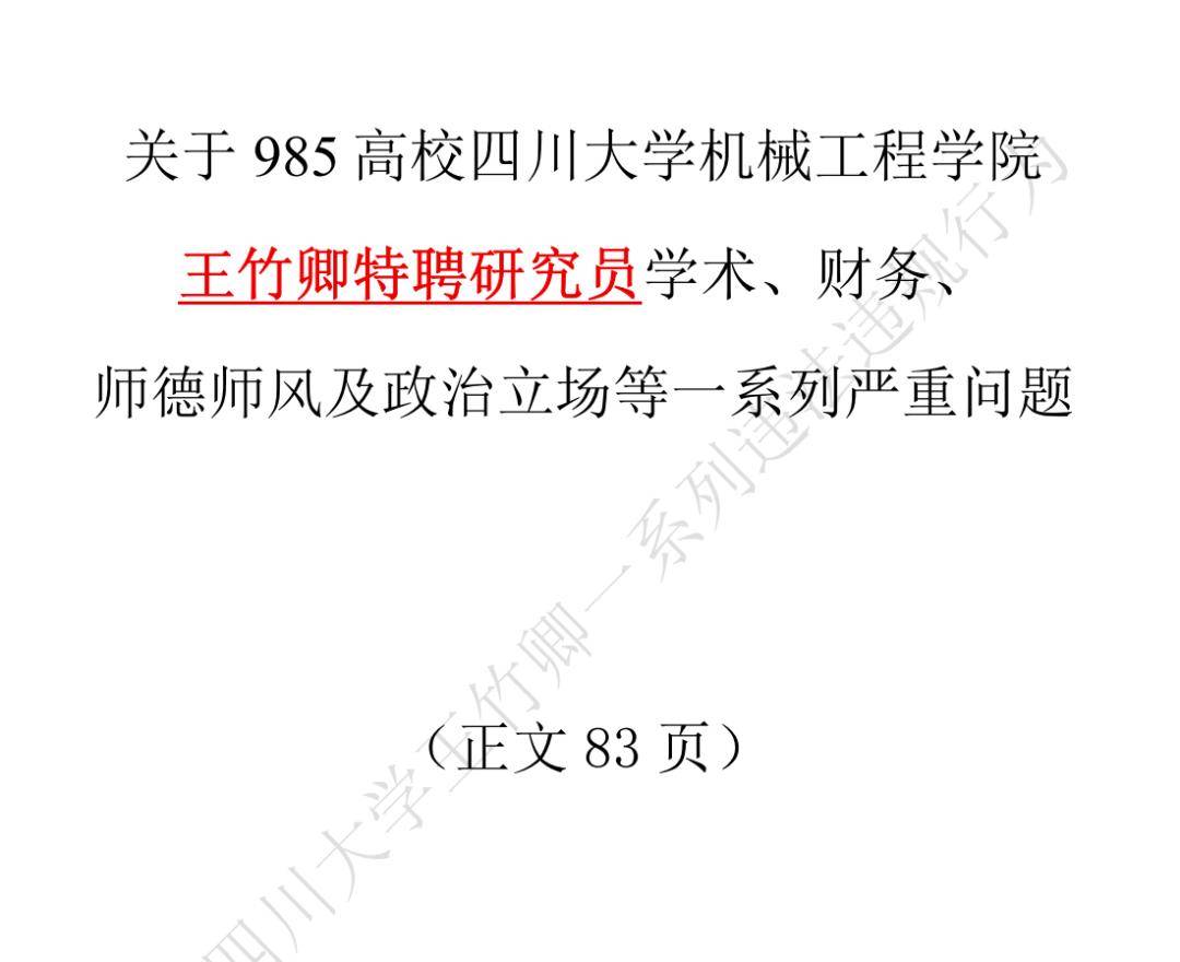 近日, 四川大学机械工程学院博导王竹卿被课题组多名硕博生联合实名举报,举报内容涉及 学术不端、侵占科研经费、师德失范等多个问题。