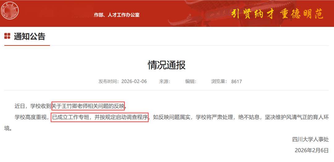 2月6日,四川大学发布情况通报: 学校高度重视,已成立工作专班,并按规定启动调查程序。如反映问题属实,学校将严肃处理,绝不姑息,坚决维护风清气正的育人环境。