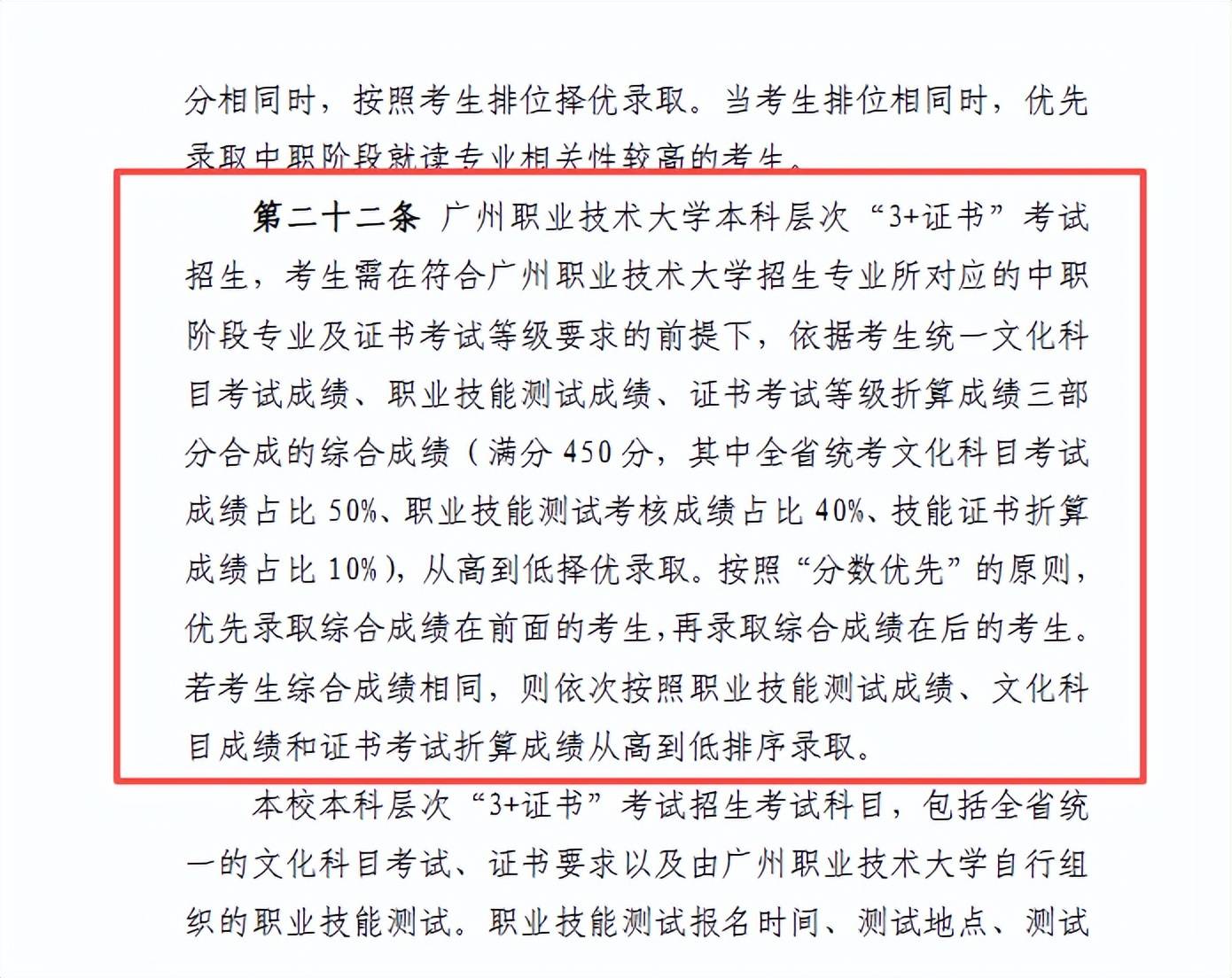 广州职业技术大学在《广州职业技术大学2026年春季高考招生章程》中提到“广州职业技术大学本科层次“3+证书”考试招生,考生需在符合广州职业技术大学招生专业所对应的中职阶段专业及证书考试等级要求的前提下,依据考生统一文化科目考试成绩、职业技能测试成绩、证书考试等级折算成绩三部分合成的综合成绩(满分450分,其中全省统考文化科目考试成绩占比50%、职业技能测试考核成绩占比40%、技能证书折算成绩占比10%),从高到低择优录取。按照“分数优先”的原则,优先录取综合成绩在前面的考生,再录取综合成绩在后的考生。若考生综合成绩相同,则依次按照职业技能测试成绩、文化科目成绩和证书考试折算成绩从高到低排序录取。”