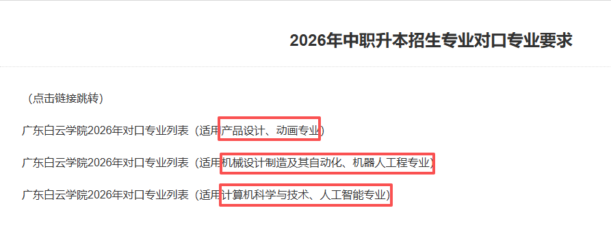 广东白云学院在学校官网公布了2026年中职升本招生专业对口专业要求,共6个专业招生,分别是产品设计、动画、机械设计制造及其自动化、机器人工程、计算机科学与技术、人工智能专业,今年没有新增专业。