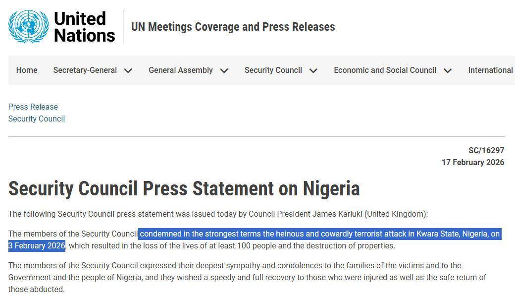 安理会声明说,此次袭击造成至少100人死亡,并造成财产损失。安理会成员向遇难者家属以及尼日利亚政府和人民致以深切同情和诚挚慰问,祝愿伤者早日康复,并希望被绑架人员安全获释。