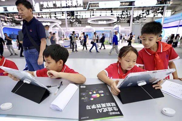 2025年9月11日,北京,小学生在服贸会教育服务专题展上使用人工智能通识课系统学习。图源:视觉中国