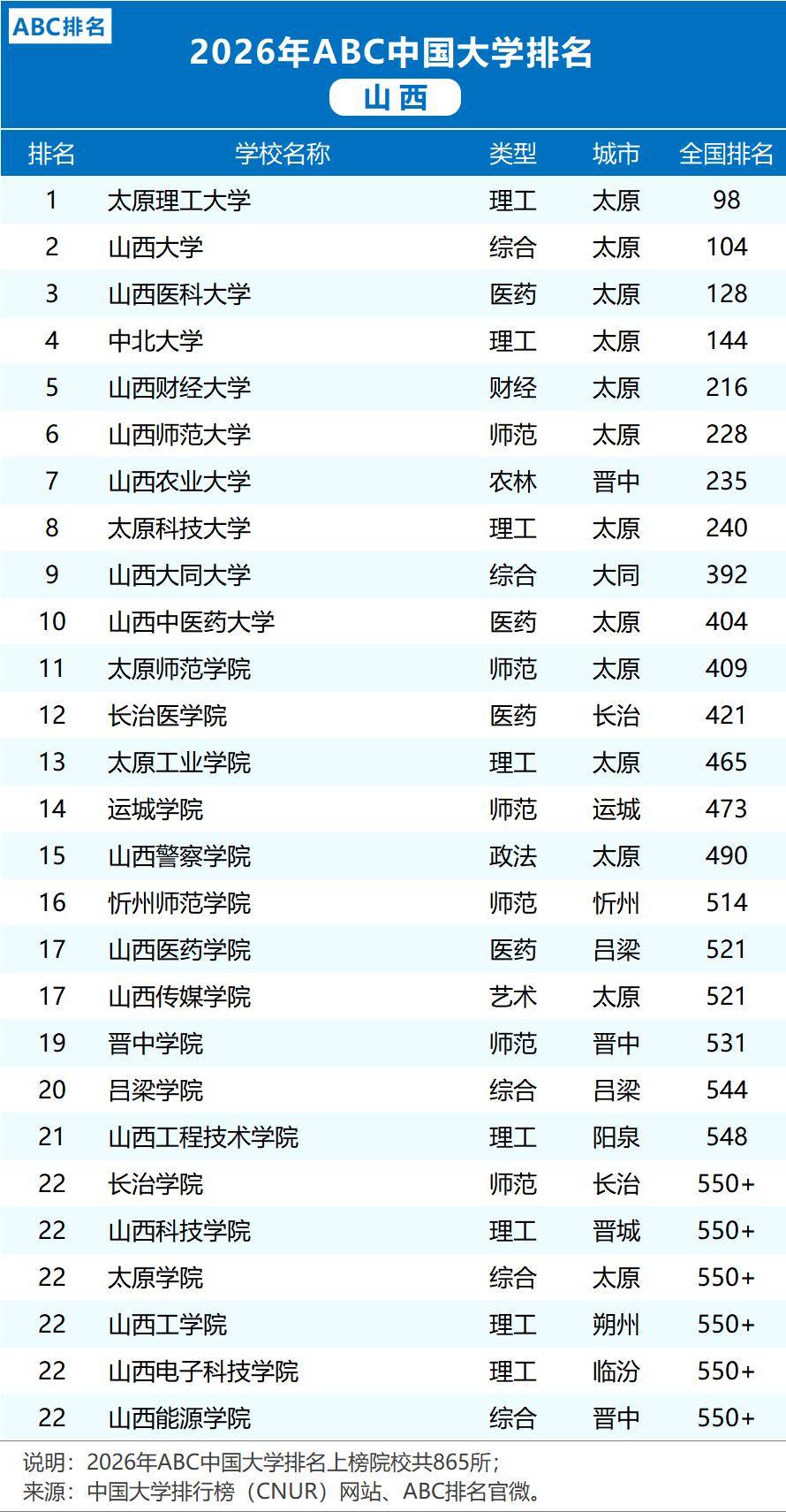 2026年ABC中国大学排名揭晓,山西高等教育格局呈现新气象。太原理工大学稳居省内榜首,全国排名第98位。山西大学(104)、山西医科大学(128)、中北大学(144)、山西财经大学(216)、山西师范大学(228)、山西农业大学(235)、太原科技大学(240)等院校紧随其后,构成山西高校的中坚力量。山西大同大学(392)、山西中医药大学(404)、太原师范学院(409)、长治医学院(421)等院校也展现出各自的特色与实力。众多省属应用型高校如运城学院、太原工业学院等,均在全国865所上榜高校中占据一席之地。