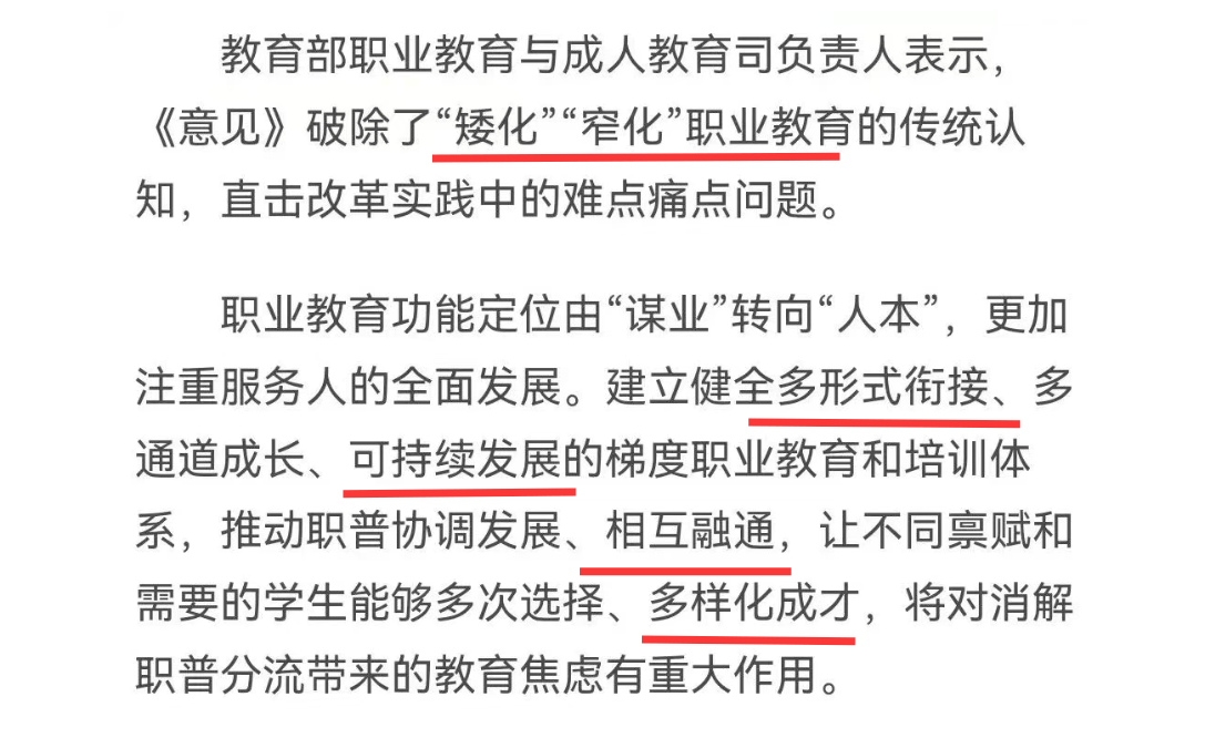 后来我在《人民日报》发表的文章中,也看到了类似的观点。大概意思是说,现在的职业教育功能定位,已经整改了,主要是为了跟普通的教育相互融通,帮助学生多样化成才,有更多选择。
