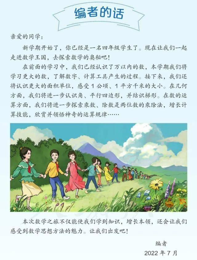这幅被网友们盛赞“老艺术家下手没轻没重”“以前的教材都是细糠”的插图,出自2022年“人民教育出版社”新编的“小学数学四年级上”。