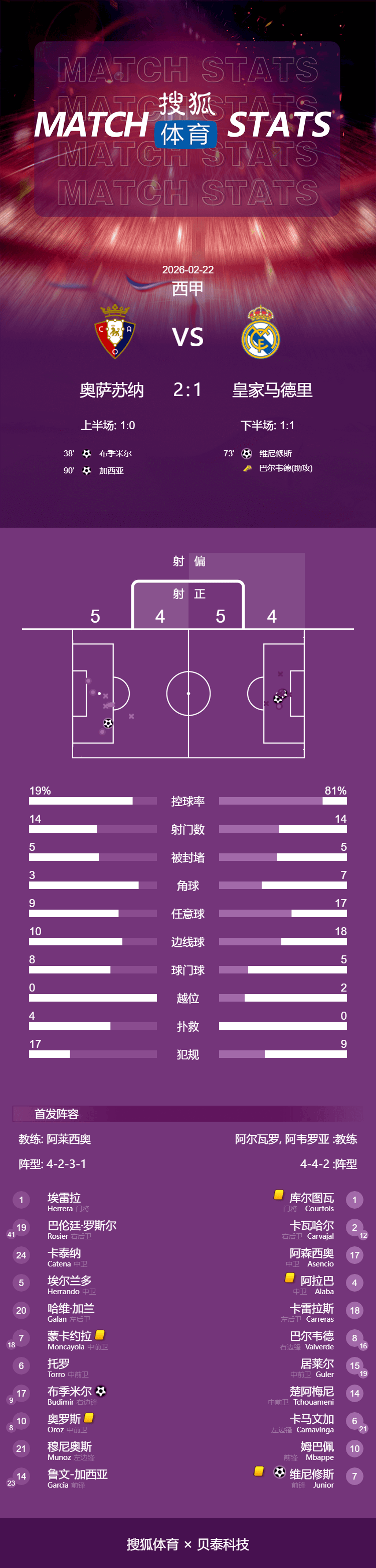 2026年2月22日凌晨4点,2025-2026赛季西甲联赛第25轮展开一场焦点战役,皇马前往客场对阵奥萨苏纳。上半场,库尔图瓦出击放倒布季米尔被判罚点球,布季米尔亲自主罚命中。下半场,巴尔韦德送助攻,维尼修斯破门。皇马后场传球失误,莫罗助攻,劳尔-加西亚完成绝杀。最终,皇马1-2不敌奥萨苏纳,各项赛事4连胜被终结,在先赛的情况下目前只领先巴萨2分。