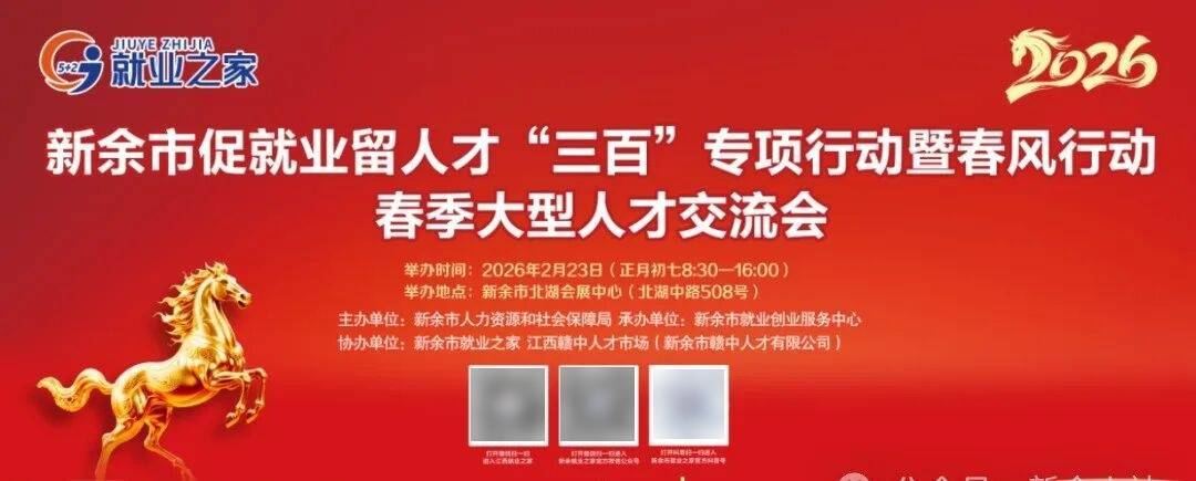 为深入实施“六大行动计划”,全面打造新型工业强市,构建人才强市战略,同时进一步加强2026年春节期间公共就业服务,推动返乡农民工、脱贫劳动力等我市各类就业群体实现高质量就业,满足我市企业春季用工需求,新余市人力资源和社会保障局决定举办主题为新余市促就业留人才“三百”专项行动暨春风行动春季大型人才交流会。
