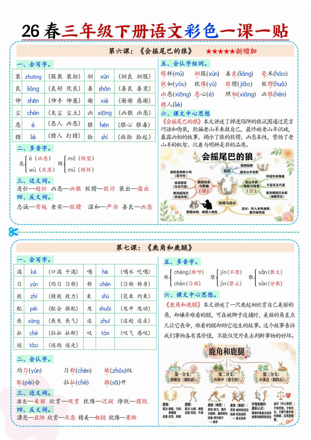 - 字词能力强化:通过系统梳理 “会写字、会认字、多音字、近义词、反义词”,帮助孩子扎实掌握全册核心字词,告别 “提笔忘字” 和 “读音不准”。例如,《鹿角和鹿腿》一课中,明确区分了 “称” 的两个读音(chēng 称呼 /chèn 匀称),针对性攻克多音字难点。