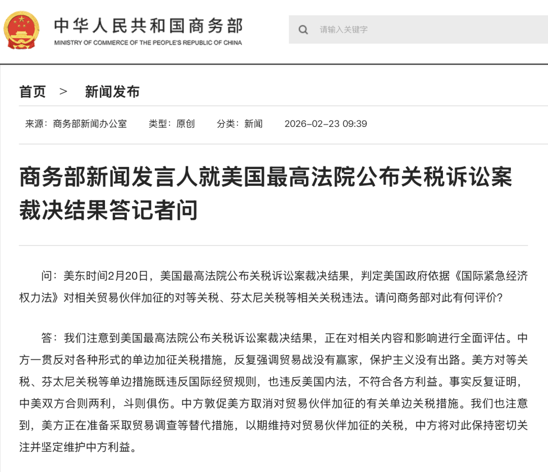 据商务部网站2月23日消息,商务部新闻发言人就美国最高法院公布关税诉讼案裁决结果答记者问。