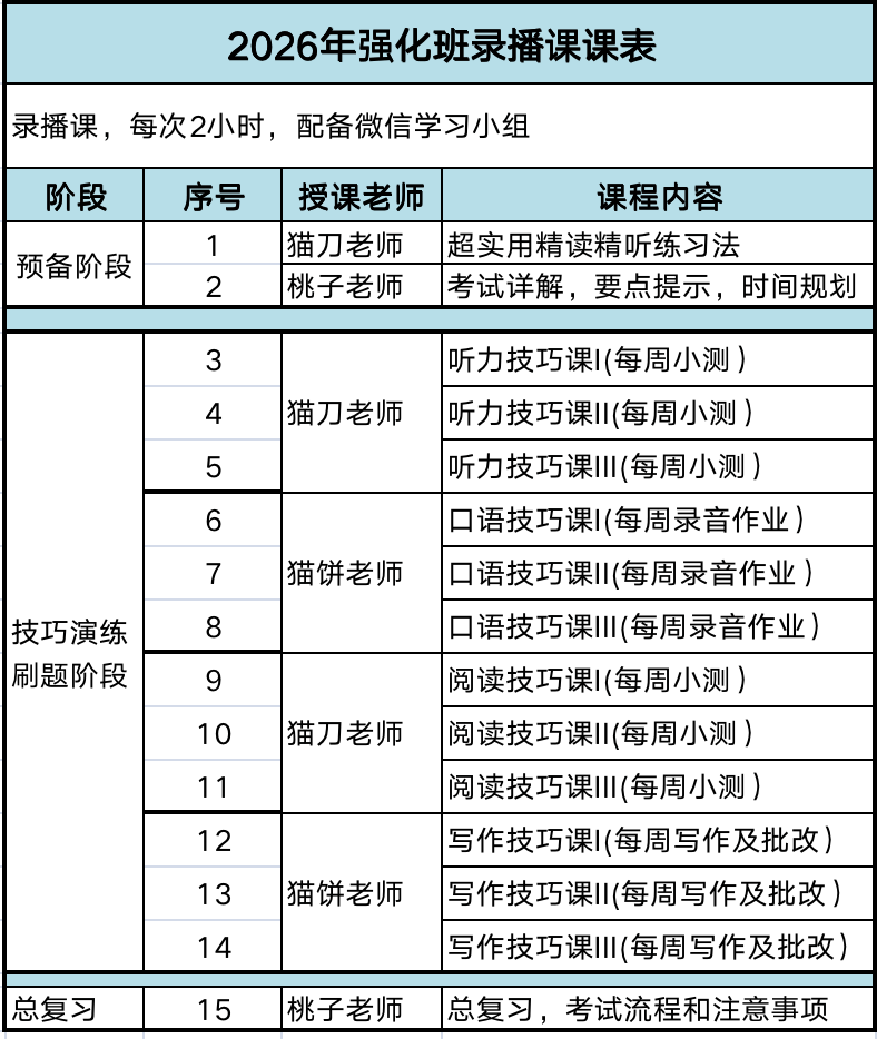 12次听/说/读/写技巧课(每门课3次/配有作业)