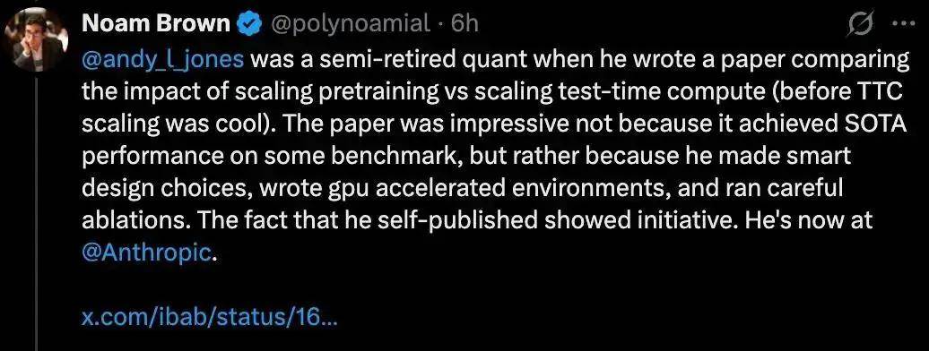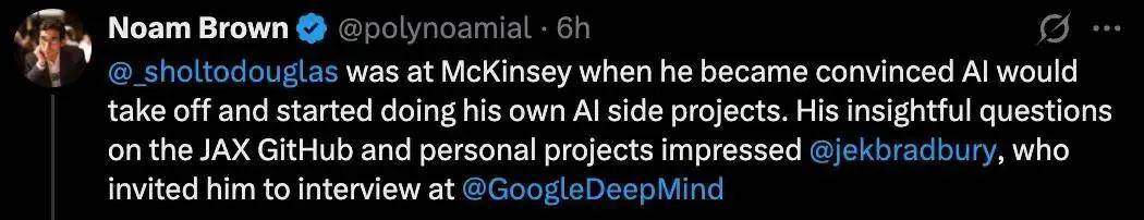 Noam Brown总结得很直白:在现有论文基础上做改进,把完整过程开源,就是向大厂证明自己的最佳方式。比起一篇看不到源码的论文,面试官更愿意相信: