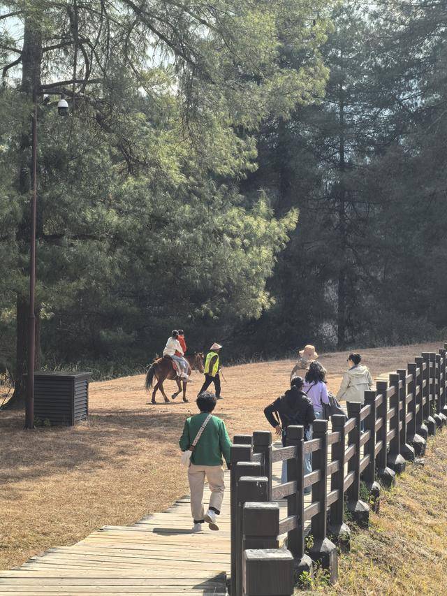 他先把马牵到栈道边,稳住,然后扶着穿白衣服的女孩上马,抓着马镫,把她的脚推进去。拍了几张,又换男孩上来。末了,他把两个孩子都抱上马背,拉着缰绳在山坡上绕了一小圈。