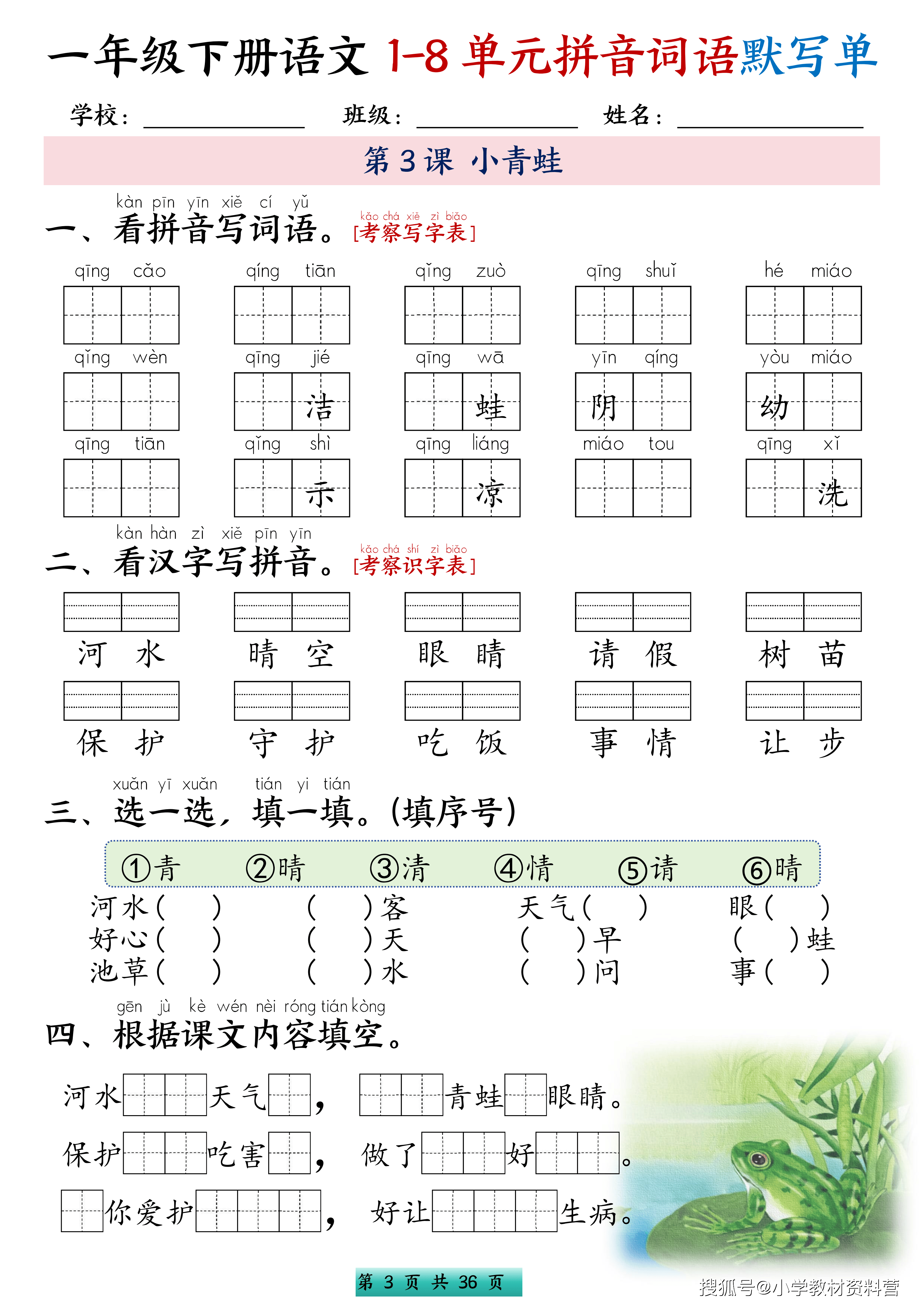 今天给大家分享:在小学一年级的语文学习中,拼音与词语是构建语言能力的重要基石。这份精心整理的《一年级下册语文 1-8 单元拼音词语默写单》,涵盖了课本核心的生字词、拼音读写及课文重点内容,提供了系统的复习与巩固工具。从 “春夏秋冬” 的四季认知,到 “姓氏歌” 的文化启蒙,再到 “小青蛙” 的自然观察与 “猜字谜” 的思维拓展,每一课的默写内容都紧密贴合教材,帮助反复练习中夯实语文基础。