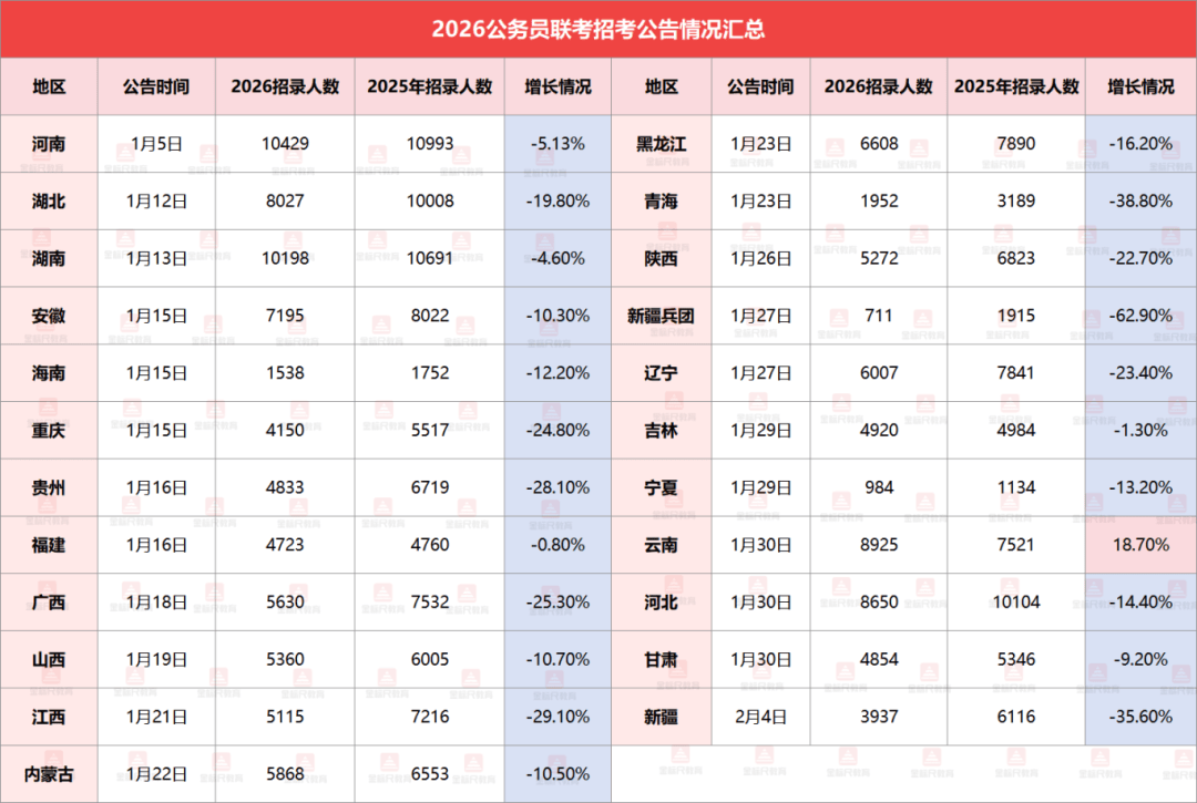 目前2026公务员联考招录公告均已发布完毕,整理所有省份的招录数据,一个招录变化摆在面前——整体缩招。