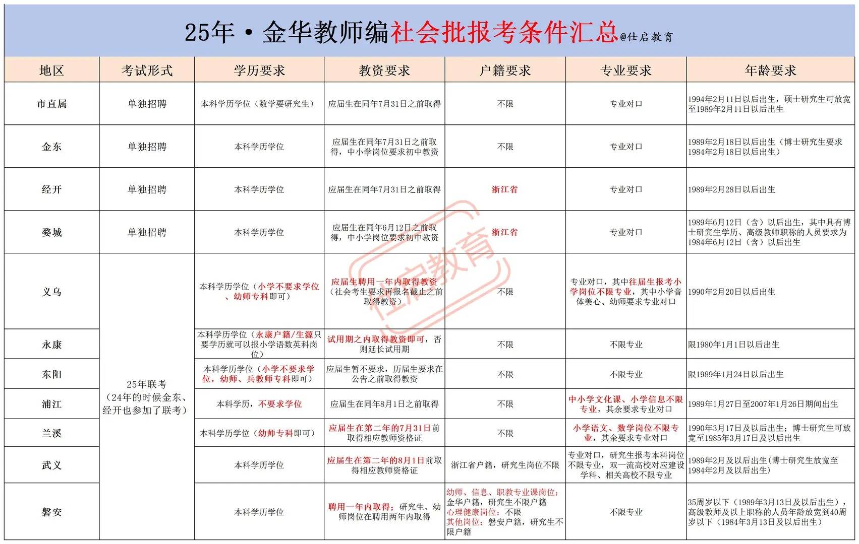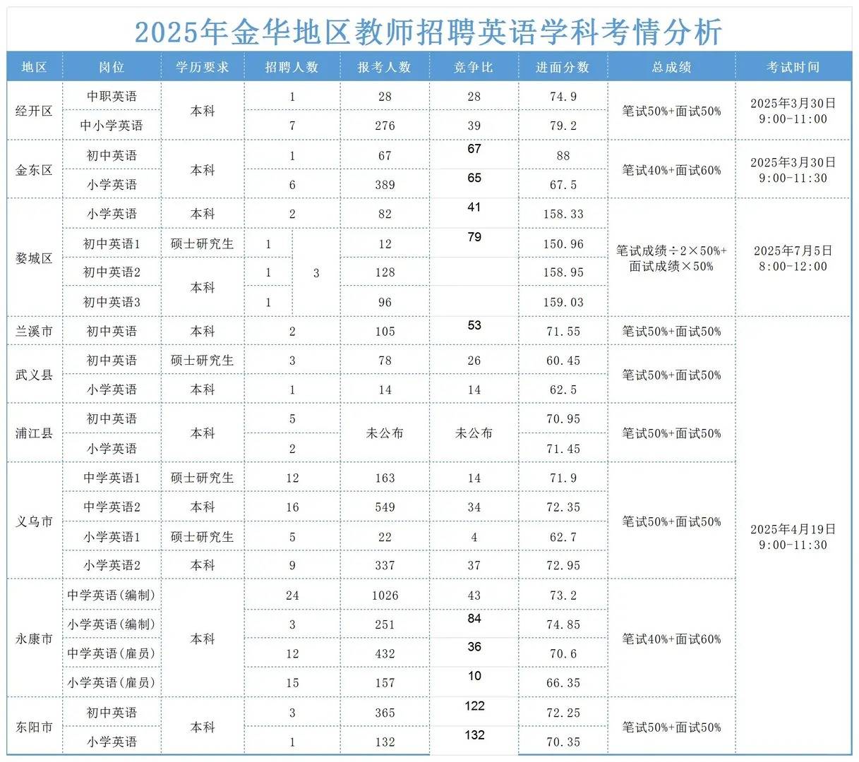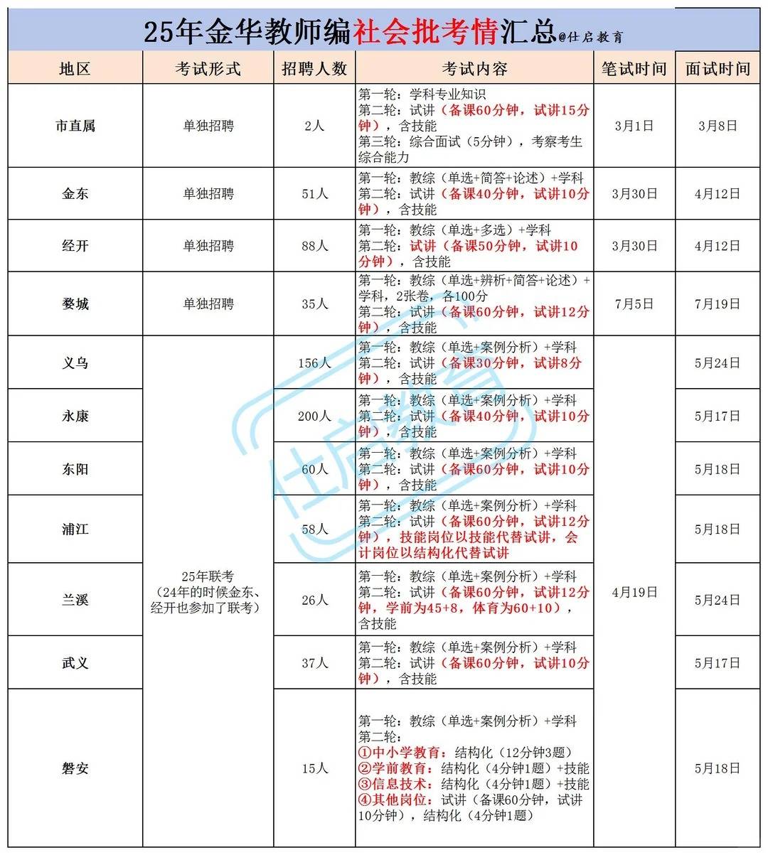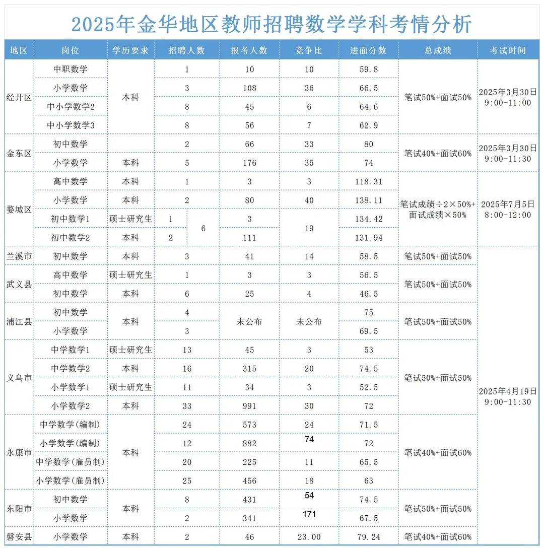 金华社招分为县城联考【金华很大的联考】 其中义乌永康招聘人数超多,报名人数也很多 同一张试卷的 金华的主城区都是单独区招聘的,每个考试的内容和时间都不一样 一般市直属金东 经开会早于县城的联考 金华社招的条件非常宽松,很多地区不限户籍,不限专业,有的也不限学位 当然考试的人也就多了 关于具体学科考试内容 下一篇文章会阐述的