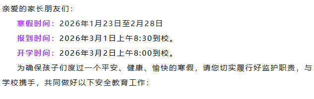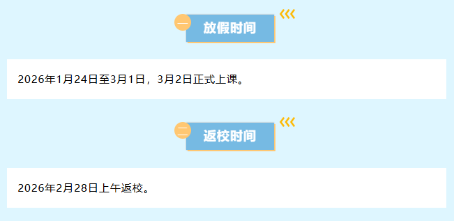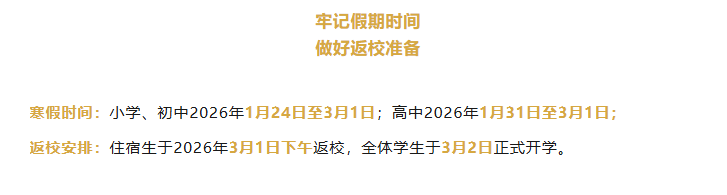 该校小学、初中寒假时间从1月24日至3月1日,全体学生于3月2日正式开学。