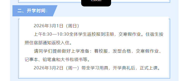 该校报到时间为3月1日。上午8:30一10:30全体学生返校报到注册,交寒假作业。