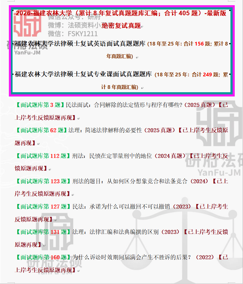福建农林大学法律硕士复试专业课面试真题题库(18年至25年:合计249题;累计8年真题汇编)