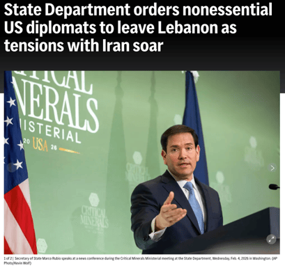 △美联社报道,由于随时可能发动军事打击,美国已下令贝鲁特大使馆非必要外交官及家属离开黎巴嫩