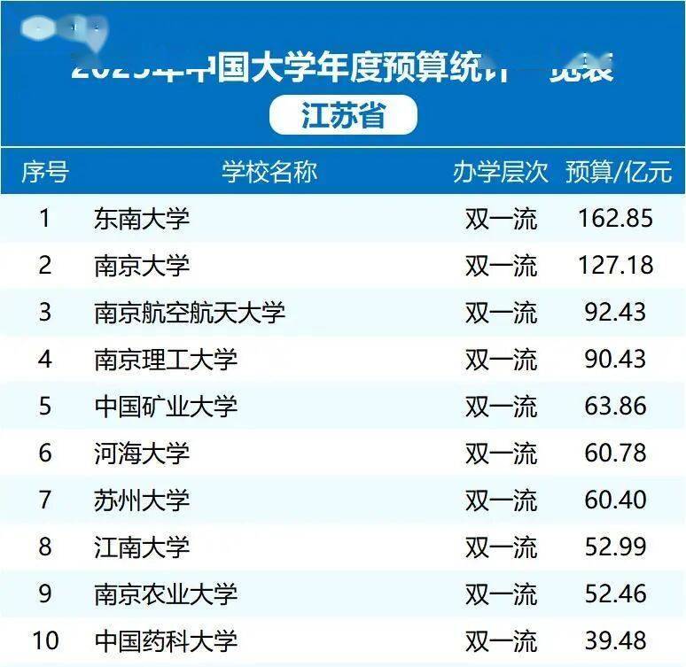 2025年江苏省高校预算排名揭晓,前十强总预算突破960亿元,彰显教育强省实力。东南大学以162.85亿元领跑,南京大学凭借127.18亿元紧随其后,南京航空航天大学和南京理工大学分别以92.43亿和90.43亿稳固第三、四位。河海大学(60.78亿)、苏州大学(60.40亿)、江南大学(52.99亿)等高校在水利、材料科学领域持续发力,资金投入推动创新引擎。南京农业大学(52.46亿)和中国矿业大学(63.86亿)虽排名第九和第五,但差距显著,中国药科大学以39.48亿首次跻身前十,体现了江苏高校多元化发展的强劲势头。