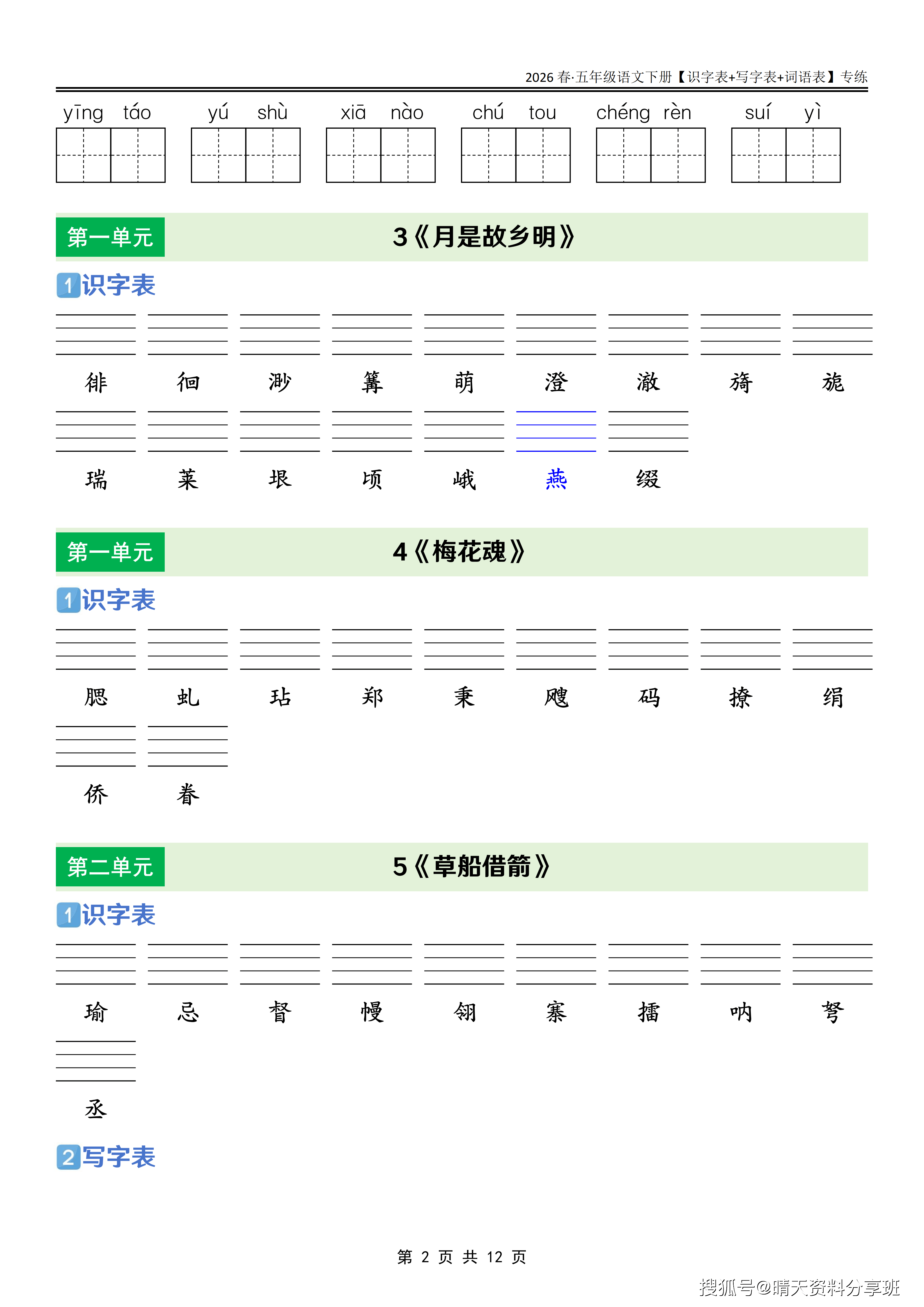尤其是部编版五年级语文下册,前两个单元涵盖古诗、散文、名著选段等丰富文体,字词难度明显提升,不仅有多音字、形近字的辨析,还有大量出自经典篇目、需要精准掌握的词语。为了帮助同学们高效完成预习,我们整理了 1-9 课的识字表、写字表和词语表专项练习,涵盖《古诗三首》《祖父的园子》《草船借箭》等重点课文,。