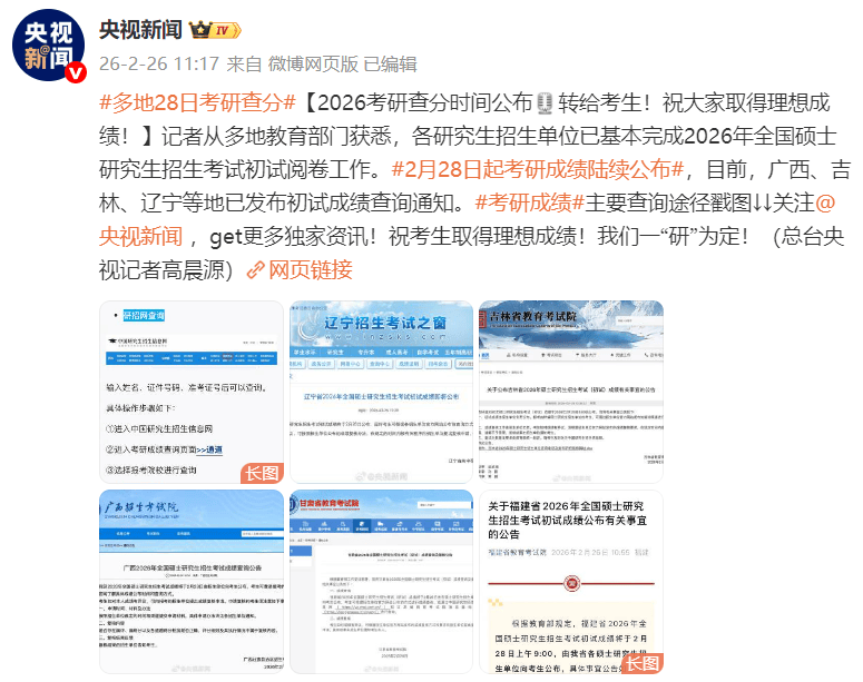 据央视新闻:记者从多地教育部门了解获悉,各研究生招生单位已基本完成2026年全国硕士研究生招生考试初试阅卷工作,将于2月28日起陆续向考生开通成绩查询渠道。请考生密切关注报考招生单位官方信息,通过官方指定渠道查成绩。