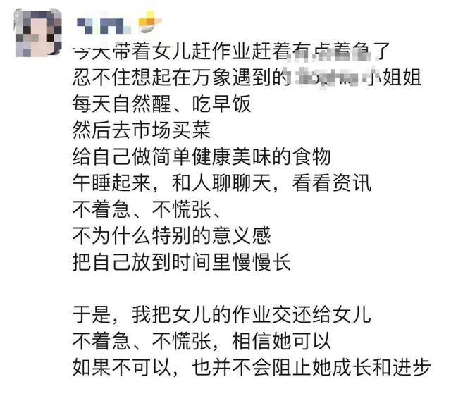 为了缓解焦虑,她和朋友聊天、和AI对话,稳住自己之后,她发了一条朋友圈:“把女儿的作业交还给女儿,不着急、不慌张,相信她可以。如果不可以,也并不会阻止她成长和进步。”