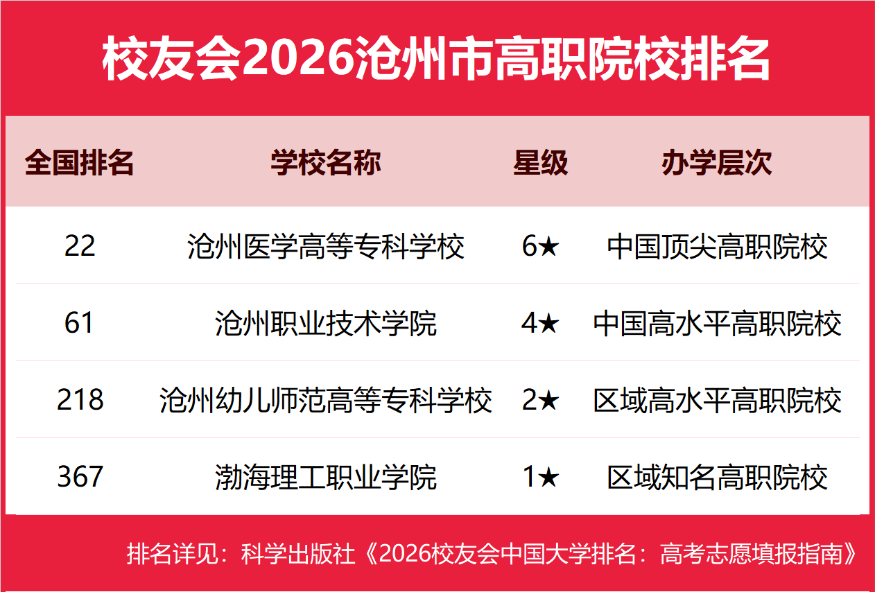 校友会2026沧州市高职院校排名,沧州医学高等专科学校第一,沧州职业技术学院、沧州幼儿师范高等专科学校前三