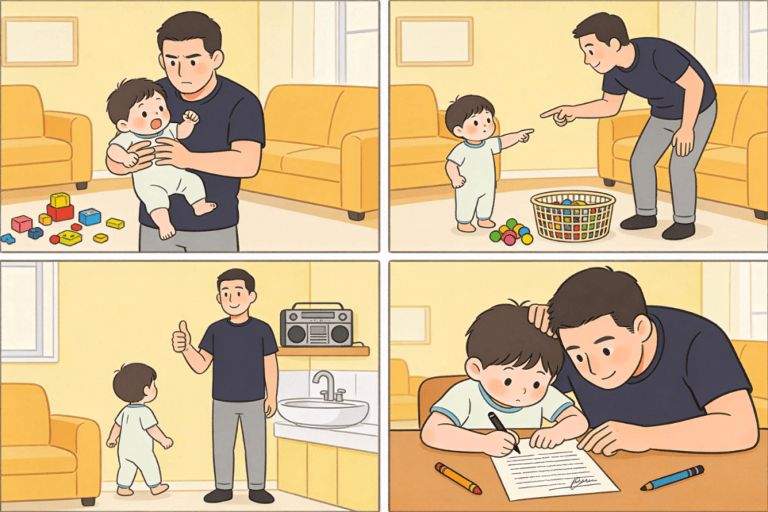 别说“你要懂事一点”“要有礼貌”,这对孩子来说太抽象了。直接告诉他动作:“小手放膝盖”“玩具玩完放回筐里”。最好带着他做一遍,确保他真的懂了。光说不练假把式,爸爸们尤其要以身作则,你自己都做不到的事情,别指望孩子能遵守。