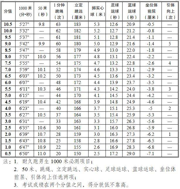 2.一分钟跳绳等《国家学生体质健康标准(2014年修订)》中没有收录的选考项目,参照执行教育部、国家体育总局2007年颁布施行的《国家学生体质健康标准》中初中三年级相关项目的评分标准。