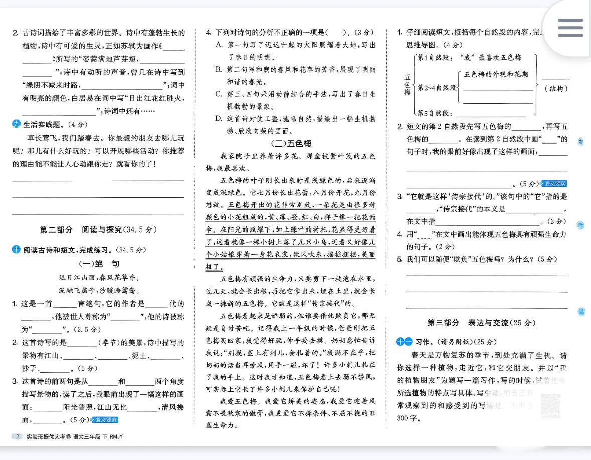 二年级阅读不仅是语文学习,更是理解能力的培养。资料中的 “阅读理解” 模块,如《村居》《我不是最弱小的》,教会孩子如何快速把握课文主旨,理解作者的情感;通过 “新情境”“跨学科” 题目,如 “新职业”“动物药方”,让孩子学会在真实场景中运用语文知识,培养逻辑思维和应用意识。这些内容不仅能提升孩子的阅读能力,更能培养孩子的观察力、思考力和表达力,提升核心素养。