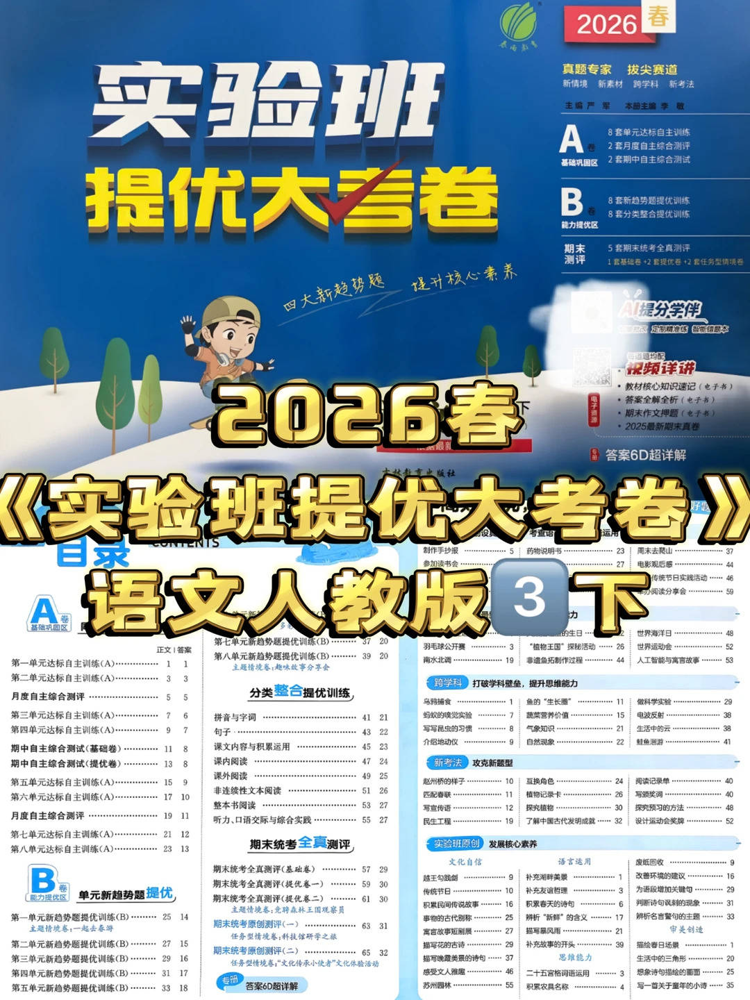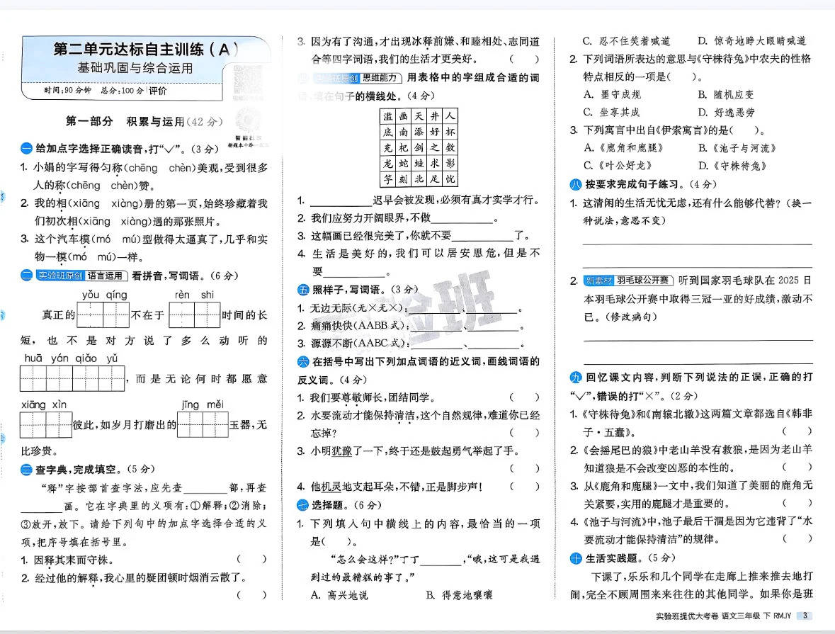 A/B 卷分层设计,让复习不再盲目。孩子可以先做 A 卷巩固基础,再做 B 卷挑战提优,快速定位薄弱环节,大大提升学习效率。同时,资料中的内容都是考试的核心考点,孩子通过反复练习,能轻松应对单元测试和期末考试。当孩子能够熟练识字写字、理解课文、运用词语时,自信心也会随之增强,从而更加热爱语文学习,为三年级的语文学习打下坚实基础。