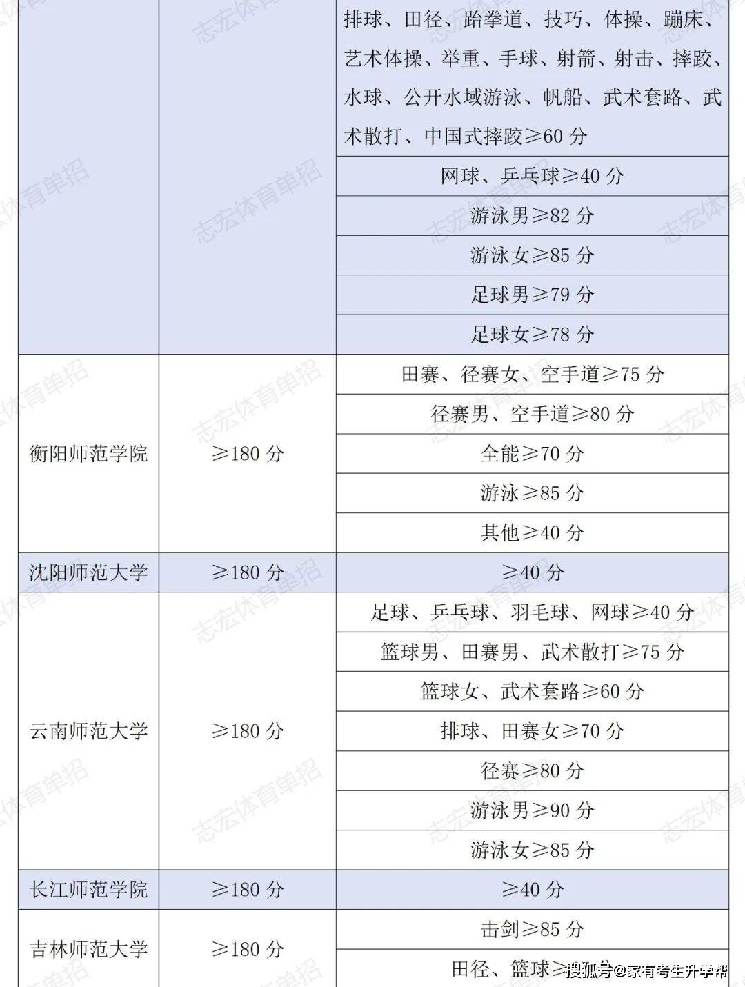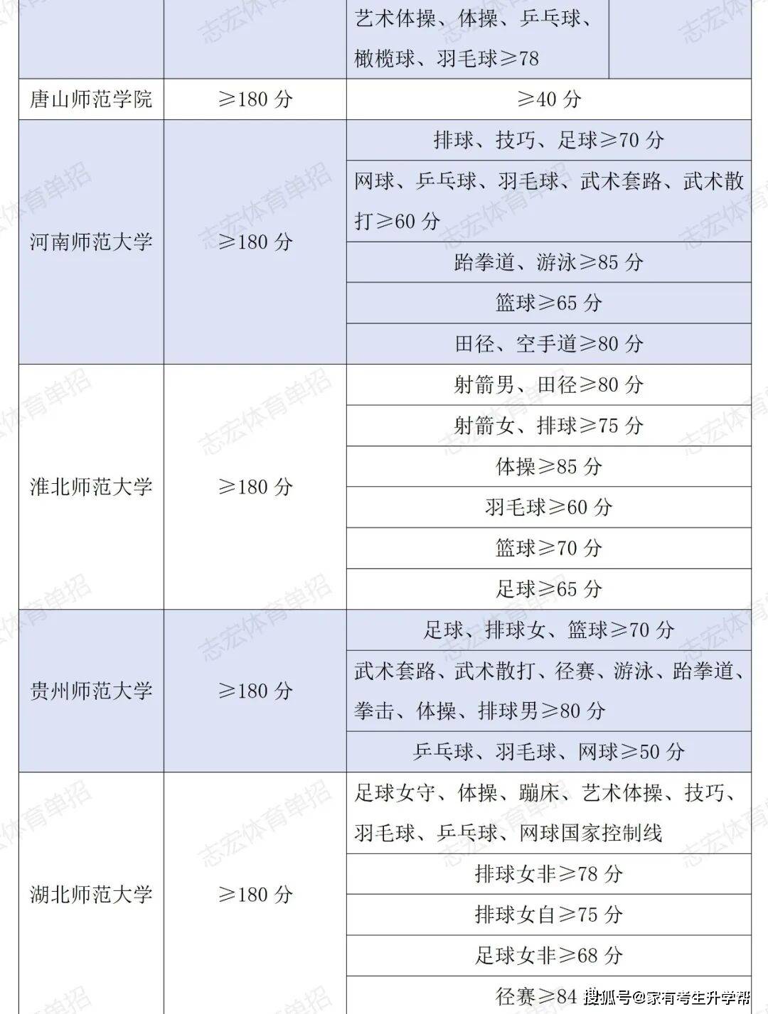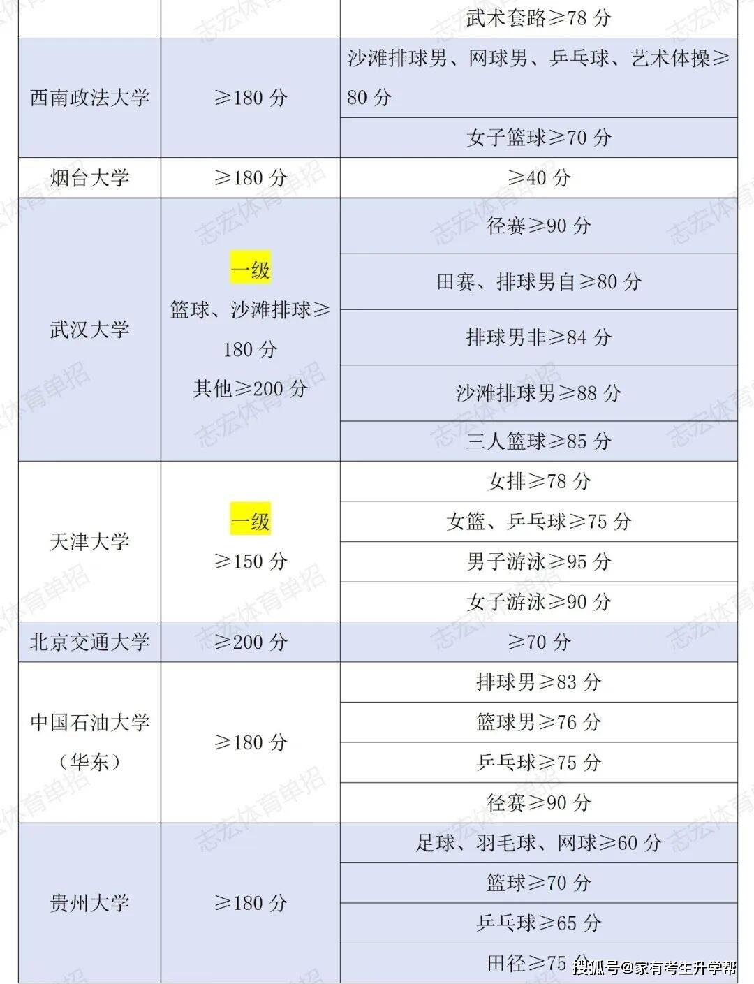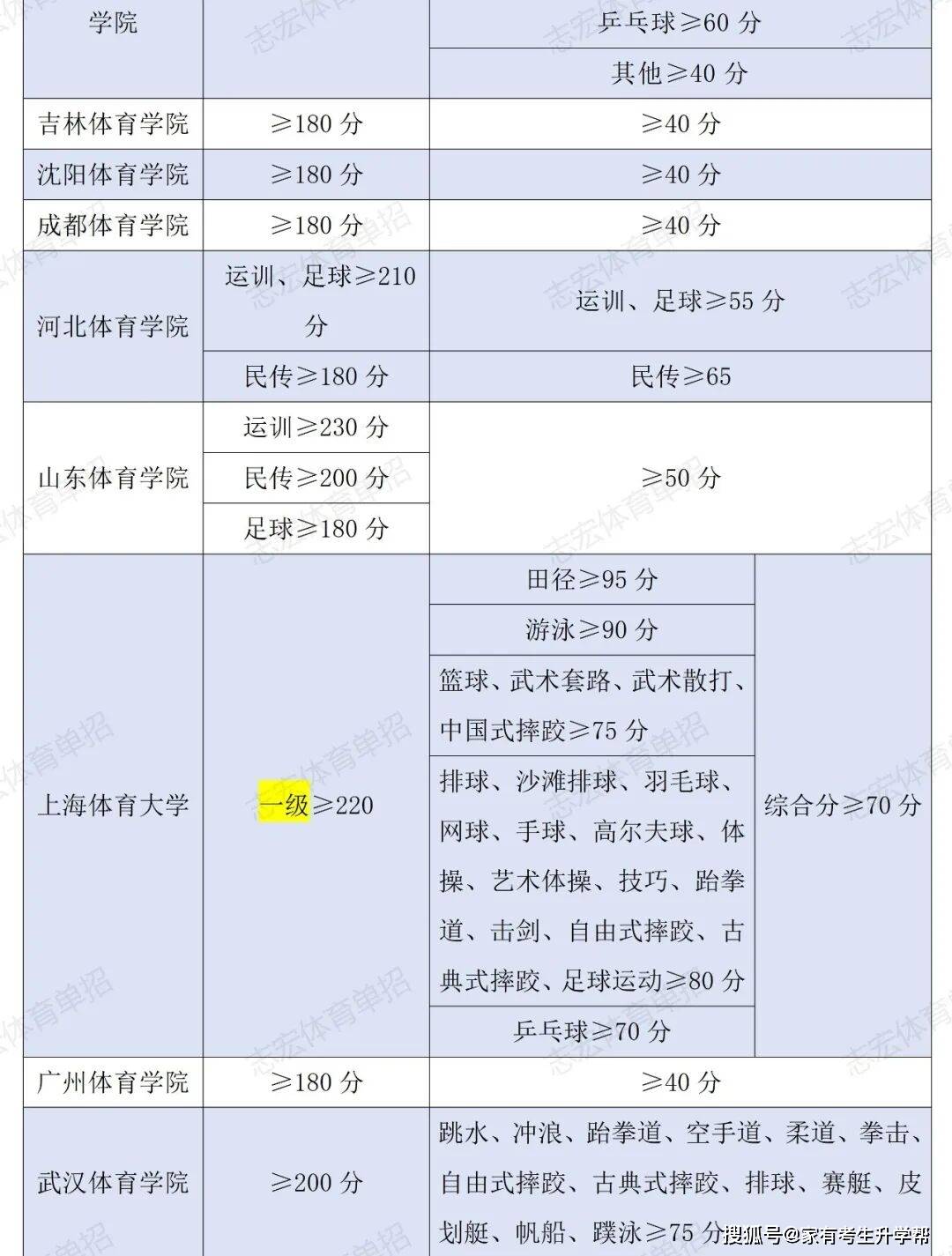 根据体育单招管理办法要求,体育单招录取控制线要求为在文化成绩不低于180分的基础上,在专项成绩不低于40分的基础上,由各招生院校根据本校实际情况综合确定本校文化和专项控制线,并在招生简章中公布。我们根据2026年各院校最新的招生简章统计了189所院校对各项目文化成绩和专项成绩的最低要求。